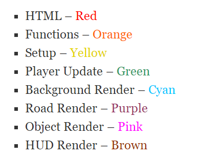 当然,还有很多其他 3D 渲染方法可以同时保证性能和视觉效果。如果我有更多的可用空间,我会更倾向于使用一个 WebGL API 比如 three.js ,我在去年制作的一个类似游戏“Bogus Roads”中用过这个框架。此外,因为它使用的是 requestAnimationFrame ,所以需要一些额外的代码来确保帧速率不超过60 fps,增强版本中我会这么用,尽管我更喜欢使用 requestAnimationFrame 而不是 setInterval ,因为它是垂直同期的(VSyn,VerticalSynchronization),所以渲染更丝滑。这种代码的一个主要好处是它非常兼容,可以在任何设备上运行,尽管在我旧 iPhone 上运行有点慢。