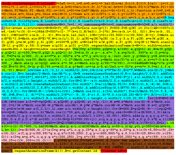 无论哪种方式,策略都是一样的:尽最大可能重复代码,然后用压缩工具压缩。最好的例子是 c.width,c.height和 Math。因此,在阅读这段代码时,请记住,你经常会看到我不断重复一些东西,最终目的就是为了压缩。
