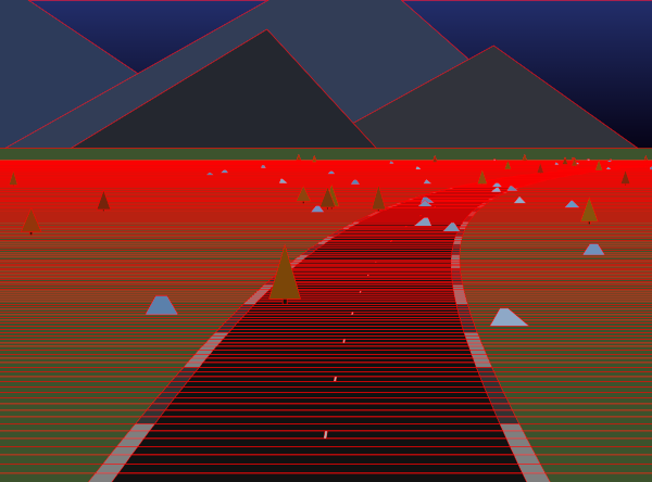 最初我还想涉及其他车型,但为了达到 2KB 的要求,必须要进行特别多的削减,因此我最后放弃了这个想法,用风景作为障碍。这些位置是随机的,也比较靠近道路,不然它们太稀疏,就很容易行驶。为了节省空间,对象高度还决定了对象的类型。