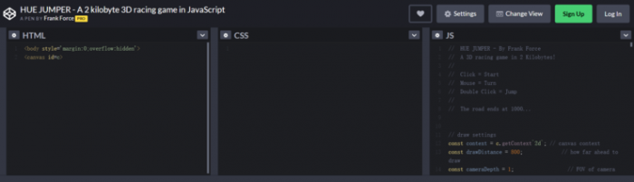 在此期间,他们受到三重因素的启发。一是赛车游戏,包括怀旧向的80年代赛车游戏,他们在非常早期的硬件上推动实时 3D 图形,所以作者沿用了相同的技术,用纯 JavaScript 从头开始实现做 3D 图形和物理引擎;还有一些现代赛车游戏带来了视觉设计的灵感,比如《Distance》和《Lonely Mountains: Downhill》;二是之前 Jake Gordon 用 JavaScript 创建一个,并分享了代码;三是 Chris Glover 曾经做过一款小到只有 1KB 的 JS1k 赛车游戏。