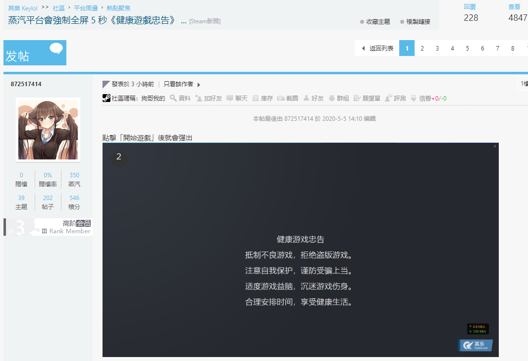 根据其乐Keylol社区的消息,网友清靈語在对Steam进一步数据挖掘后发现,完美世界的蒸汽平台内置全局防沉迷系统,启动游戏会有长达5秒的全屏强制“健康游戏公告”时间。