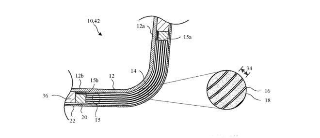 苹果这个专利想法是,MacBook Pro,或者其他设备,可以在一个平面上制作,而这个单片机身有一个 可弯曲的部分,可弯曲的部分仍然要容纳目前连接屏幕和键盘的电子元件,它必须保持机械通信能力,苹果的解决方案是让 可弯曲结构 由 可以从非压缩状态过渡到压缩状态的层层叠加而成。