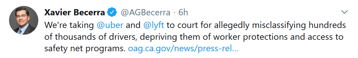 加州总检察长夏富尔·贝塞拉(Xavier Becerra)表示,本案“指责Uber和Lyft通过将大批加州驾驶员归入独立承包商来获得不公平、不合法的竞争优势。”洛杉矶、旧金山、圣迭戈等城市都加入此次法律行动。本次诉讼是在旧金山提交的。