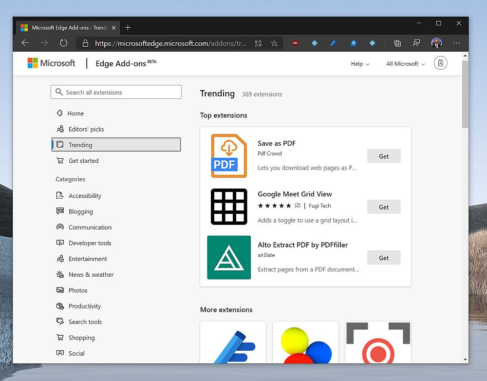尽管在数量方面明显无法和谷歌的Chrome Web Store相提并论,但基于Chromium的新版Edge外接程序(Add-ons)的规模正在迅速扩大,目前已经有上千款扩展程序供用户挑选。为了让Edge用户能够更快挑选自己喜欢的扩展程序,Edge外接程序商城进行了调整。