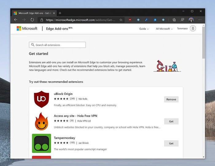 此外顶部还新增了“Get Started”页面,这里主要是微软推荐的扩展程序,基本上和“编辑推荐”的扩展程序相同,不过应该是相当于手机上的“必装应用”的意思。本次商城更新并未向所有Edge用户开放,只面向Microsoft Edge Canary 84.0.505.0及更高版本用户开放。