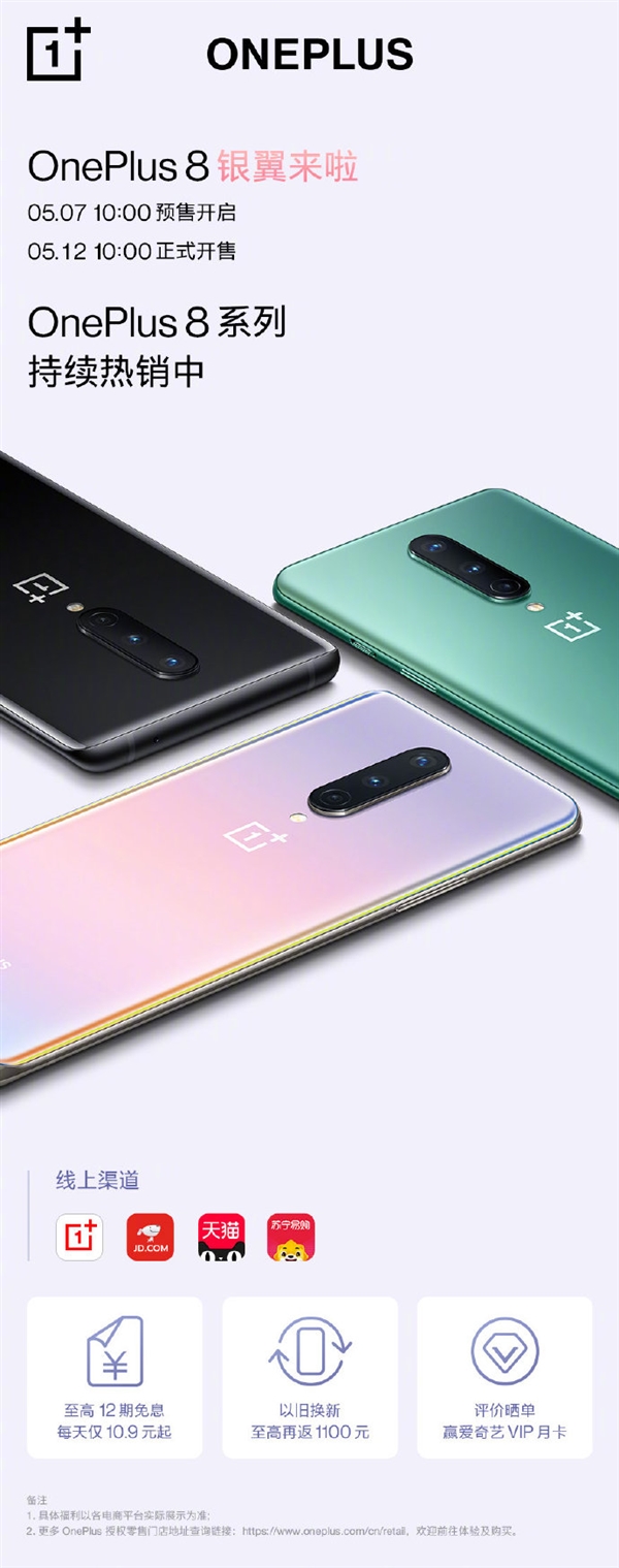上月中旬,一加8系列新旗舰发布,定价3999元起。新机主打2K+120Hz超高帧瞳孔屏,具备骁龙5G旗舰865平台,第五代高雾度AG玻璃工艺,4800万超清四摄,30WWarp无线闪充等多项卖点。 一加8系列青空、黑镜配色两款通用配色,另外,一加8还有个银翼版本,一加8Pro则有蓝调版本。