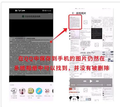 1、根据用户提供的视频显示,保存到系统相册里的图片并没有被删除,在系统相册中依然存在(如图1中红框所示),并未被删除。