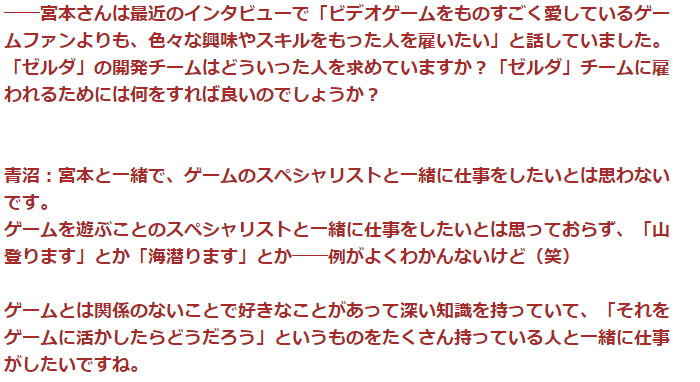 ·青沼则明确表示,也和宫本茂一样,绝对不想和游戏高玩们一起工作,原因在于兴趣广泛而不执迷于游戏的人士有着更加深广的知识,能够活用于游戏。
