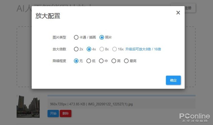 Bigjpg提供了图片类型的选项,可选卡通和照片,不同类型的图片使用相应的算法效果会更好。默认情况下,放大倍数最多可以放大4倍,不过登录升级后就可以最多放大到16倍,另外还可以选择降噪强度。
