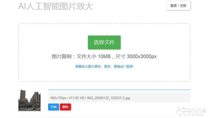 Bigjpg的使用很简单,它提供了Web网页版以及微信小程序的版本。以网页版为例,先上传一张图片(大小限制为10M,尺寸限制为3000x3000像素),然后点击“开始”,就可以利用AI放大图片了。