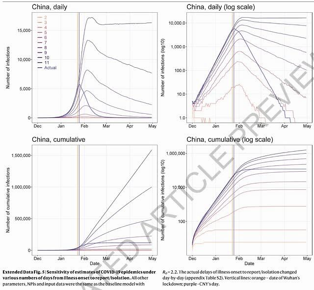 如果可以再早一周、两周或三周进行干预,则中国病例数可分别减少66%(四分位数范围 50%-82%)、86%(四分位数范围81%-90%)、95% (四分位数范围93%-97%)。