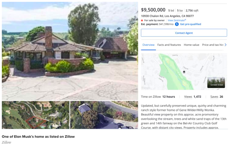 就在马斯克那条卖房的推文发出之后,有媒体很快发现,美国房地产网站 Zillow 挂出了马斯克在洛杉矶所拥有的两座豪宅,称其为 "所有者出售(For sale by owner)",标价分别为 3000 万美元和 950 万美元。