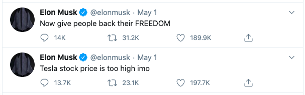 当天是劳动节,马斯克在 Twitter 抱怨人们被迫待在家里,失去了自己的自由,然后他来了一句不加标点且让人大跌眼镜的推文: