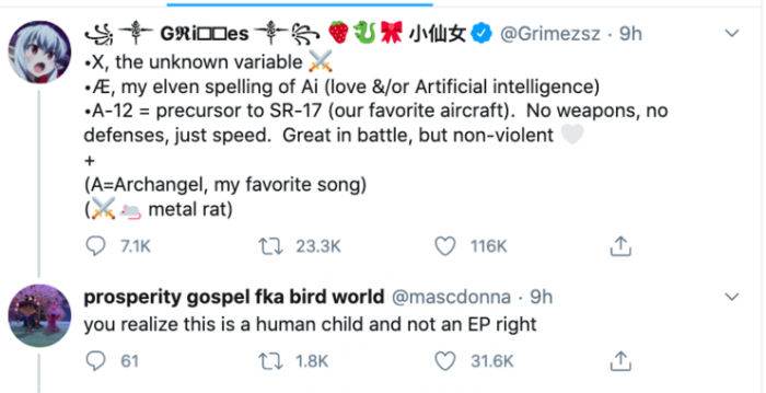 不过,到了 5 月 5 日,马斯克的女友 Grimes 则在 Twitter 上直接公布关于这个名字背后的寓意:
