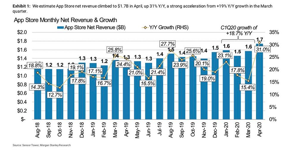App Store总下载量也比去年同期增长了40%,这是摩根士丹利2015年开始追踪下载数据以来的最大增幅。该分析师确实预计,随着各国开始放松对冠状病毒的封锁措施,App Store的增长率将在今年第二季度达到顶峰。