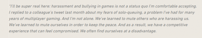 在最新的开发者日志中,拳头《Valorant》团队再次谈到了游戏中的骚扰问题,毕竟类似的问题在各大多人联网游戏中频发,开发团队表示对其非常重视。执行制作人兼《Valorant》开发团队负责人的Anna Donlon表示:“我先把话说清楚,游戏中的性骚扰和欺凌现状是不可接受的。在上个月我给同事推特的回复中我也说了自己多年来害怕单排,因为骚扰是一直存在的问题。
