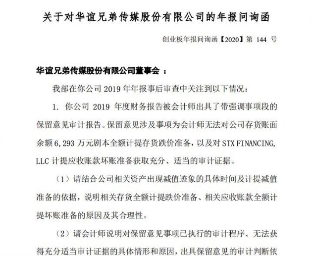 华谊兄弟收年报问询函,要求说明相关存货全额计提跌价准备、相关应收账款全额计提坏账准备的原因及其合理性;2019年度营业收入、净利润、经营活动现金流量净额均大幅下降的原因,以及公司改善经营业绩和持续经营能力的具体措施等。