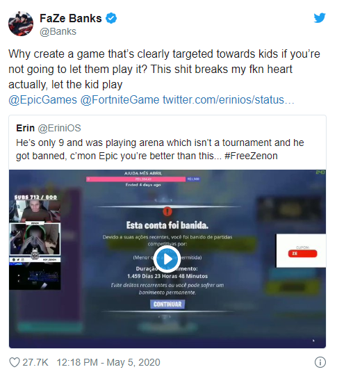 玩家Zenon是一名来自巴西的《堡垒之夜》玩家,水平优秀。然而他却在近日吃到了Epic官方的四年禁赛令,原因在于——他只有九岁。就在本周Zenon成功参加了一轮FNCS Solos公开资格赛,后者是一个奖金池高达数百万美元的竞技性资格赛。随后在直播的过程中被Epic查出年龄没达到最低参赛年龄限制,吃到了禁赛。