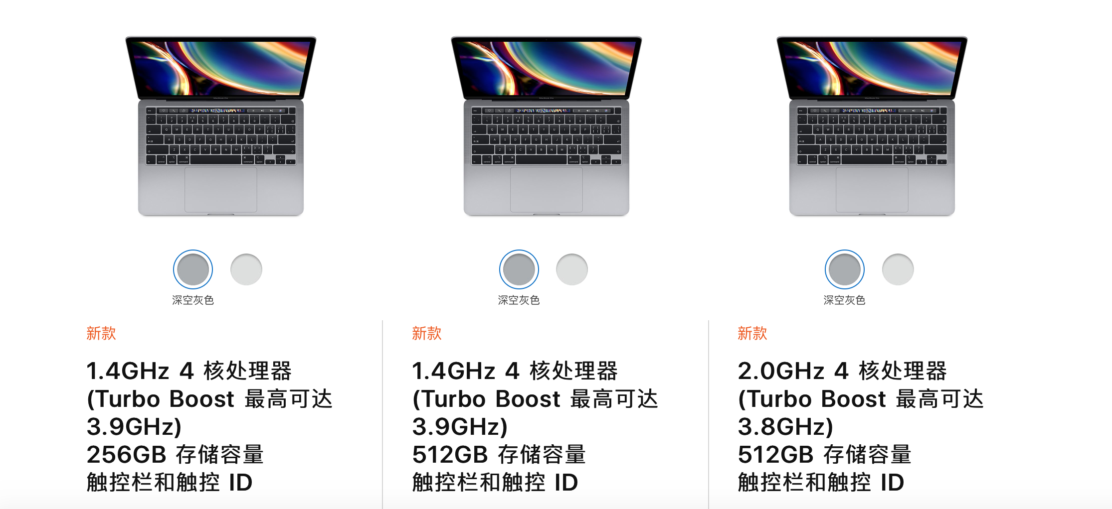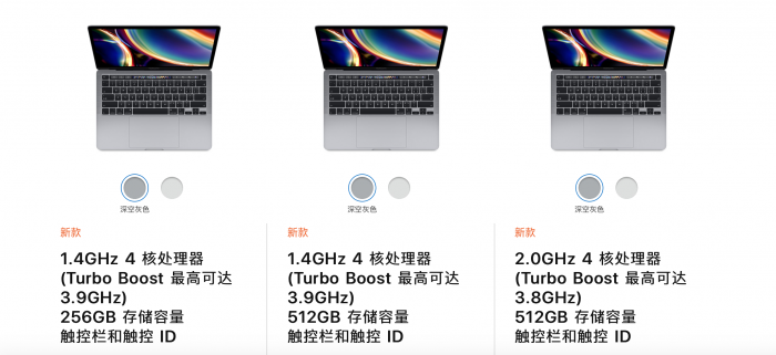 2.0GHz 4 核十代处理器 (Turbo Boost 最高可达 3.8GHz) ,512GB 存储容量,支持触控栏和触控 ID,售价 14,499 元。