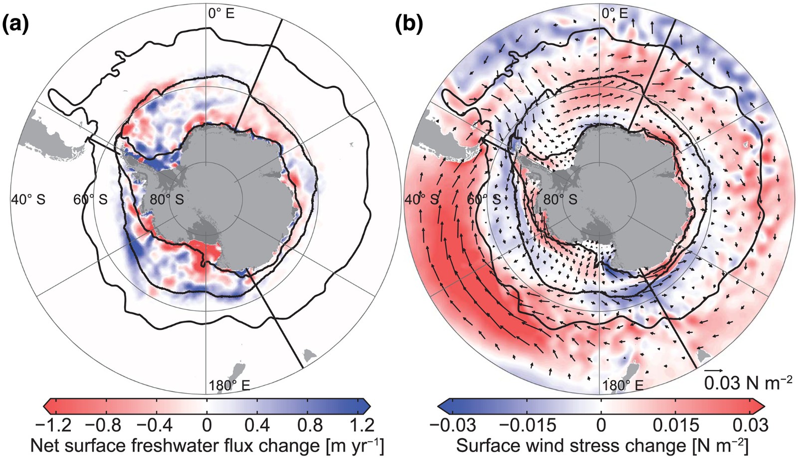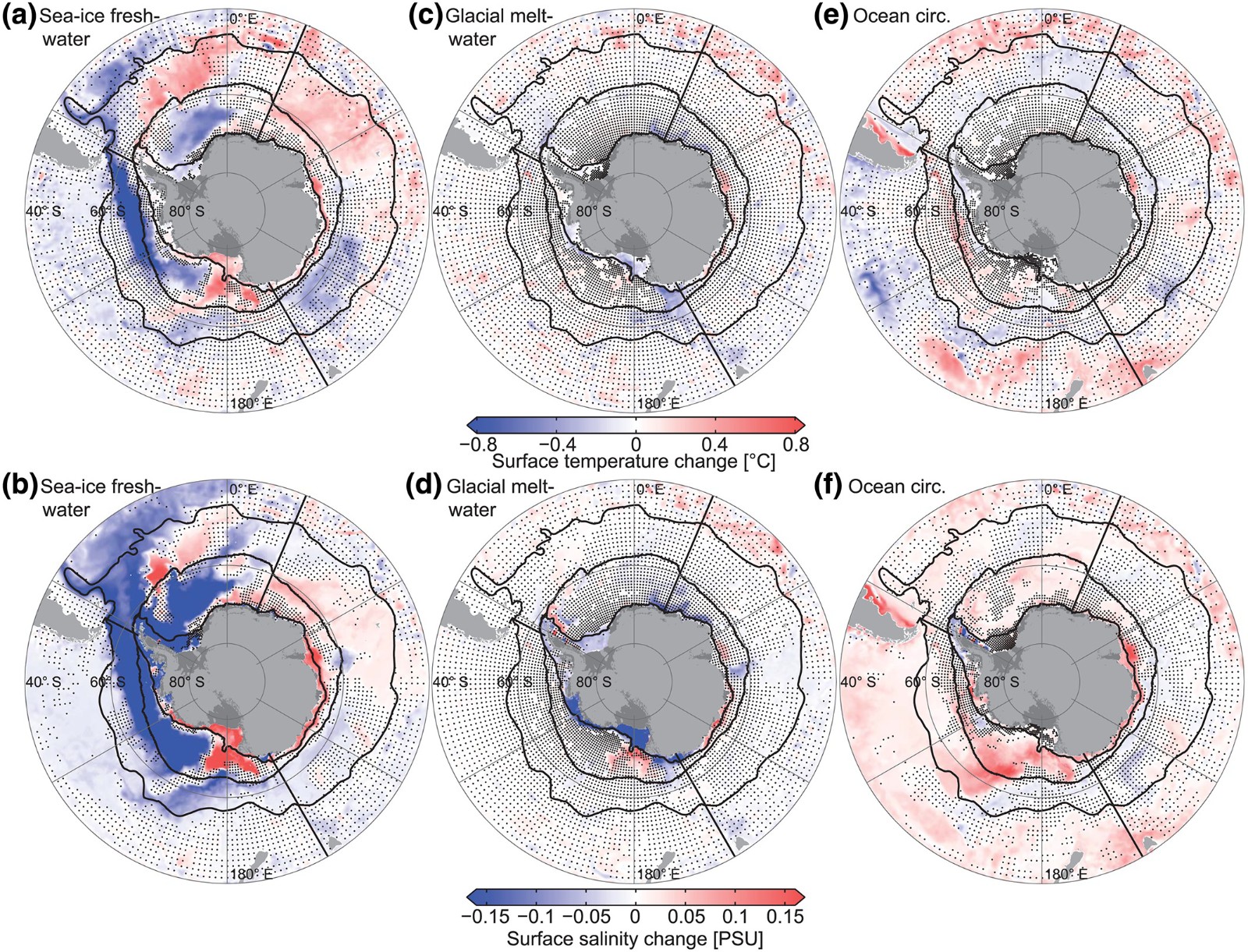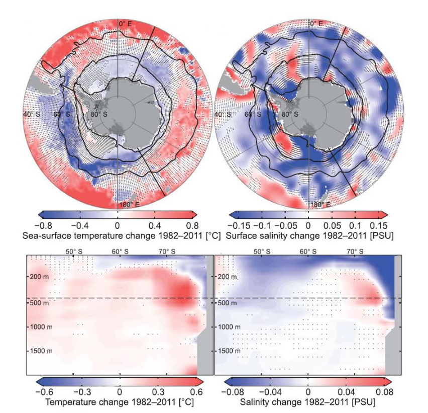 但并非所有地区的海洋都在变暖。在1982年至2011年期间,南冰洋部分地区出现了相当明显的降温。这种影响在太平洋地区最为明显,该地区的表层水温每十年下降约0.1℃(0.18°F)。南冰洋其他地区,如印度洋和大西洋板块,降温效果较弱,但仍然明显。