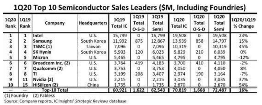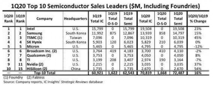 数据显示,在一年的时间内,华为海思从第15位跃升至第10位,取代了英飞凌和Kioxia挺进了全球十大半导体厂商之列。与2019年第一季度相比,同比增长54%,确保了台积电总销售额的37%。报告分析称,增长的主要原因归功于其7nm芯片订单。