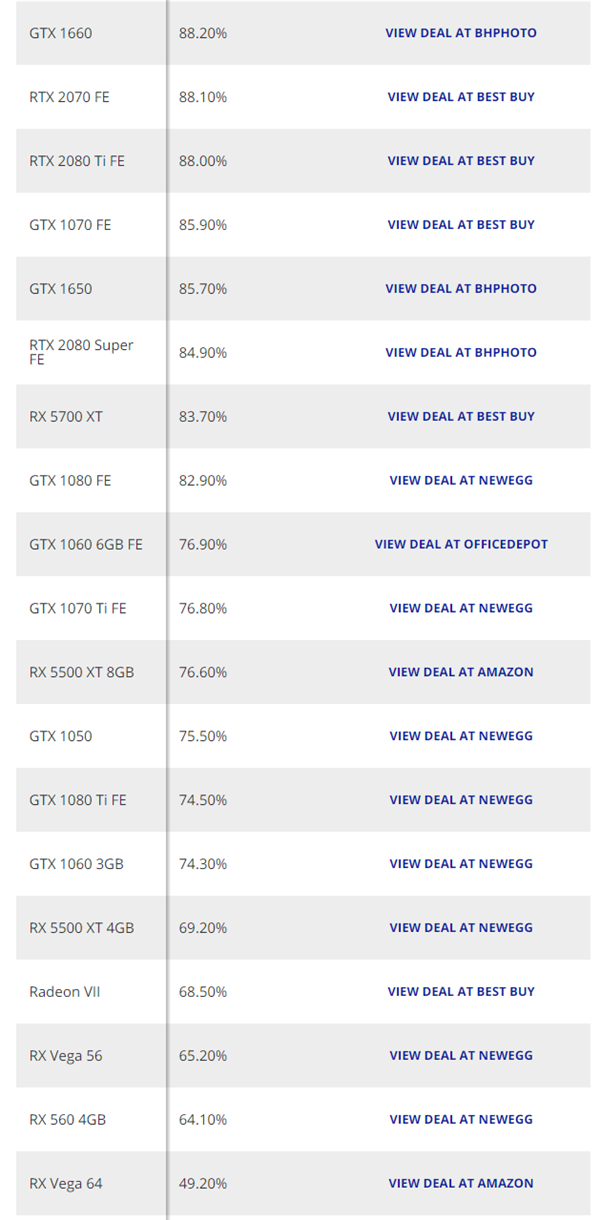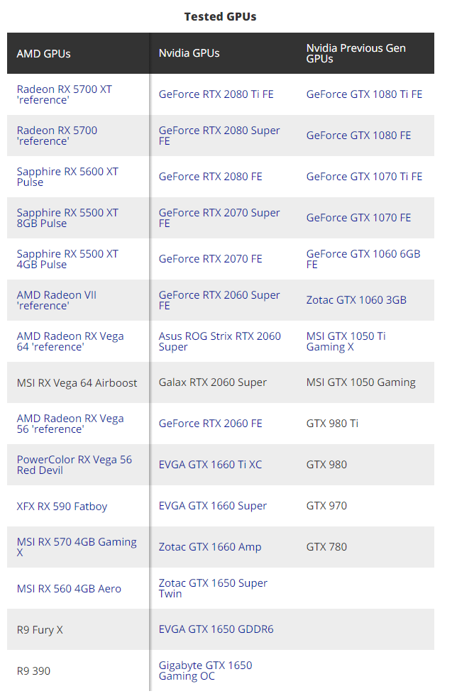 再往上就是GTX 1600 Super、GTX 1650 GDDR6、RX 5600 XT,RTX 2060 Super、RTX 2080 FE等显卡了。