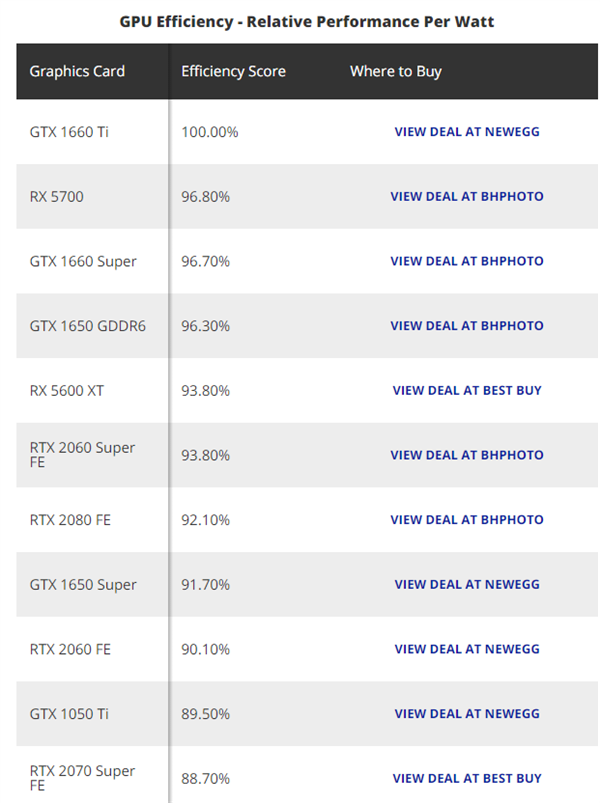 上面测试的功耗是绝对值,实际上考量显卡还要看性能,所以他们又将显卡的功耗与性能做了比较,计算出了显卡的能效排行榜,下面是相对的每瓦性能比的榜单。