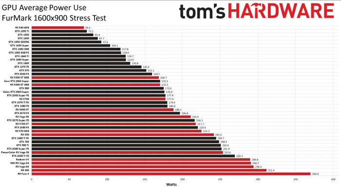 第二名的是RX 5700,这是AMD的7nm Navi家族中的次旗舰,单论GPU架构能效,AMD略输一筹,但是凭借7nm先进工艺,能效表现已经比之前的显卡好太多了,特别是跟Vega显卡相比,RX 5700系列显卡简直是脱胎换骨。