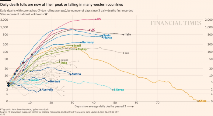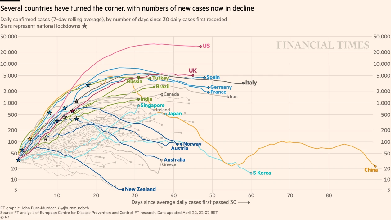 这是到4月22日全世界被COVID-19感染的人数,全球被感染总人数约270万其中美国大概占三分之一。可以看到欧洲很多国家—英国、西班牙、意大利—的感染人数都还是很高的。