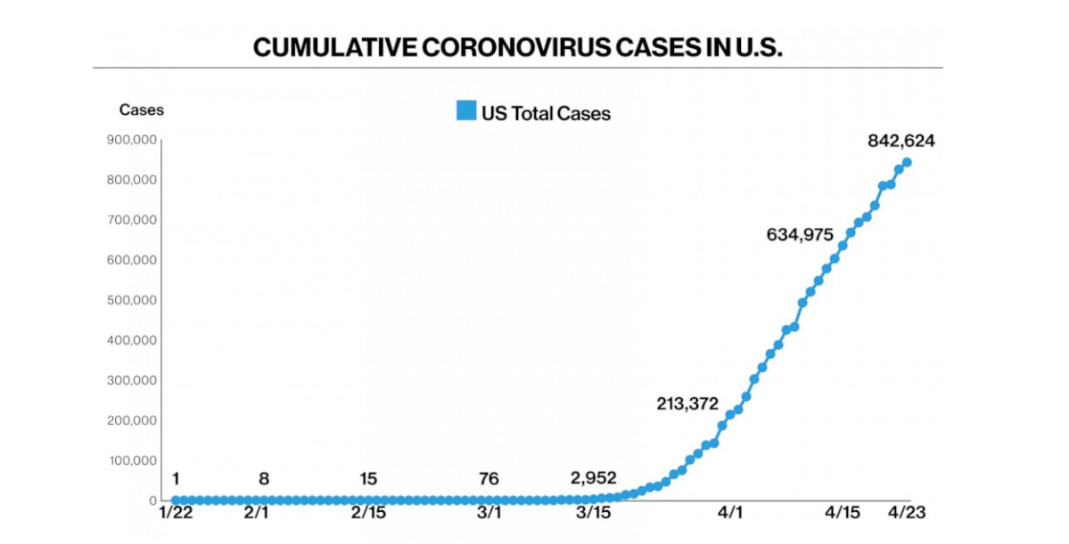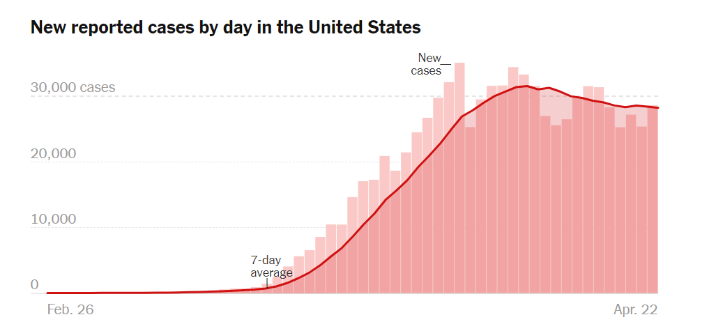 左边图显示的是美国到4月23日被感染的总人数,大概84万人。右边的图是每天新感染的人数,可以看到3月底之前新感染人数的增长是指数级的增长。4月初的时候,差不多就是平的了。在过去几个星期里,美国各个州都实行了“社交距离的防御措施”,能够看到“社交距离防御措施”还是非常有效的,起码控制到不是指数增长。现在美国平均每天被感染人数大概是3万左右。