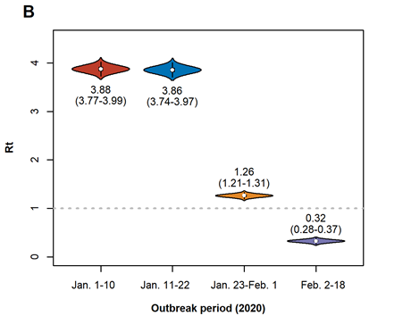 这个是估计的R值,在预印本中我们分析了2月18日前的数据,我们把1月1日到2月18日分成四个阶段,1月23日封城前是一个阶段,这个阶段里面是没有公共卫生干预的,那时候的R值估计在3.8左右。1月23日到2月1日,是封城和居家隔离阶段,这时候R值估计在1.2左右。方舱医院建立起来以后感染人数很快下降,这时候R值比1小,但是真正控制传染R值越小越好,最好到0。