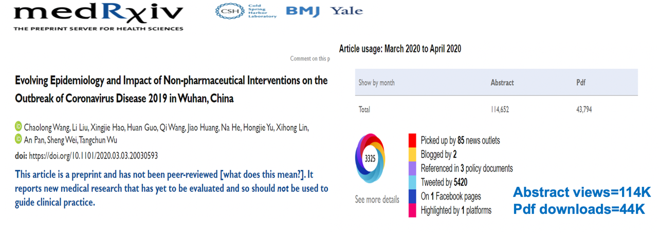 我们在2月下旬的时候和武汉华中科技大学的同济公共卫生学院老师一起合作开始分析武汉的数据。当时我们分析了26000人,分析完成以后,在3月6号把这篇文章放到MedRxiv上,这个文章在世界各地引起了非常大的反响。右边是它的数据,从3月6号以后,总共有11万人阅读文章摘要,PDF文章被下载4万多次。我把文章的主要结果放在推特上,也被非常广泛的传播。