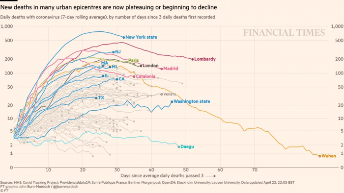 截止4月23日全世界总共死亡人数大概19万。左边的图是每个国家的死亡人数,可以看到美国每天的死亡人数和其他国家相比更高一些,现在平均每天有大约2000人死亡,其次是英国。中国现在已经控制的很好了,但是在西方国家来讲还是非常大的挑战。右边这张图是几个大城市的死亡人数,可以看到纽约州的死亡人数和美国其他州相比是最高的,其次是新泽西州。麻州的感染人数和死亡人数居于美国的第三位,我们就在麻州。那波里是意大利的一个城市,他们的死亡人数也是比较高的。