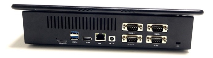 Gole11的造型有点像是小米的小爱音箱,它搭载的是11.6寸触摸屏,背部提供4个COM口,一个千兆网口,两个USB 3.0、两个USB 2.0、一个microSD卡槽、一个耳麦孔等。