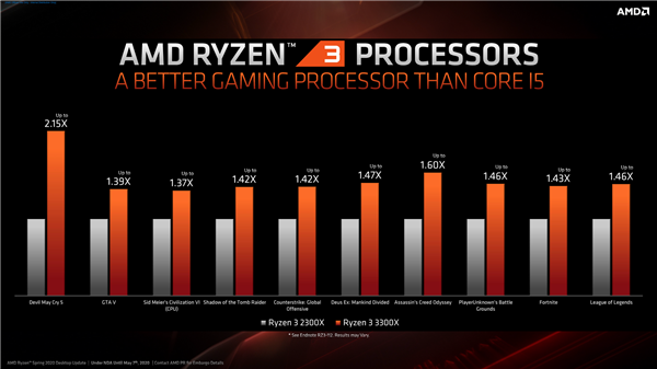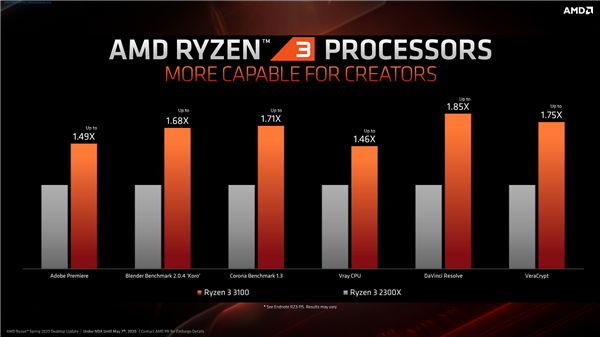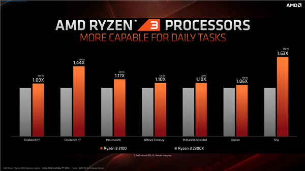 这里我们先来看看AMD官方给出的一些性能数据,主要是对比二代锐龙3的提升,供大家参考。