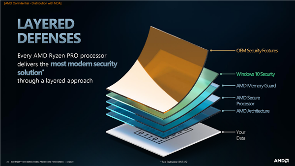 安全方面,锐龙PRO 4000采用多层部署的方式,将防御能力嵌入到从处理器到操作系统的各个层次,在客户数据之上覆盖了AMD硬件架构、AMD安全处理器、AMD内存防护、Windows 10安全、OEM安全,形成了一套完整的现代化安全解决方案,从而提供系统级安全性,堪称密不透风的防火墙,保护数据安全的同时也可以有效避免宕机。