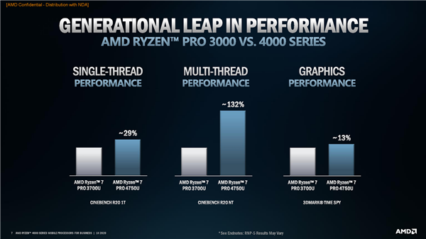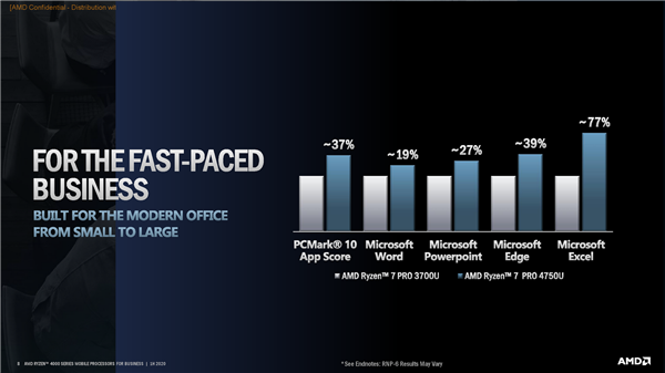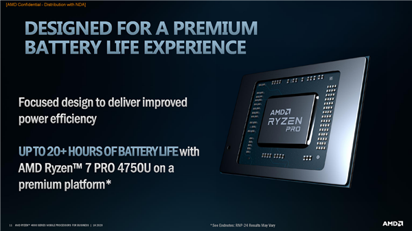 正是得益于大踏步提升的能效,AMD宣称采用锐龙7 PRO 4750U的商务本电池续航可以超过20个小时,这意味着即便外出也能满足两个工作日的办公需求。