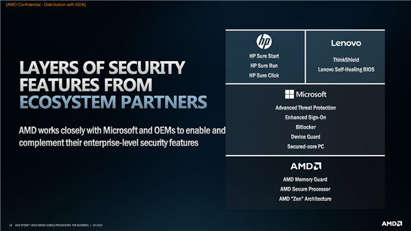 另外,AMD还与微软、OEM生态伙伴密切合作,使得锐龙PRO平台支持一系列企业级的安全特性,比如微软的Defender ATP高级威胁防护、增强登录保护、BitLocker安全加密、设备防护,惠普的Sure Start、Sure Run、Sure Click,联想的ThinkShield、自我修复BIOS,等等。