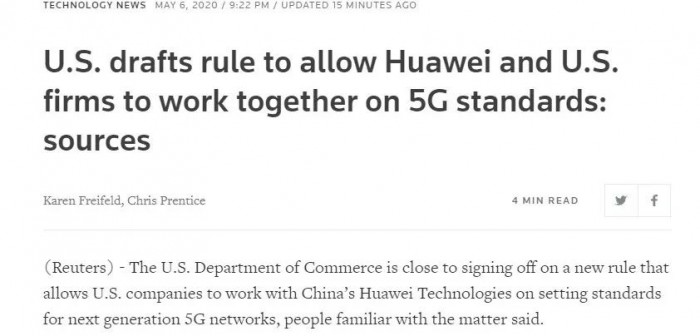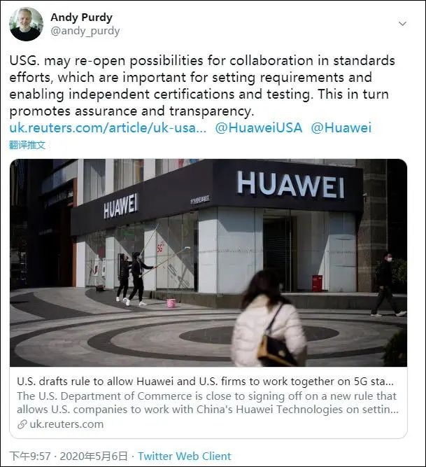 路透社5月6日突然放出消息,美商务部即将批准一项新规定,允许美企与华为展开合作,共同参与新一代5G网络标准的制定。针对上述报道,华为美国首席安全官安迪·珀迪(Andy Purdy)5月6日在个人社交媒体上回应称:美国政府可能重启在标准制定过程中合作的可能性,这对于设定需求和授权独立的认证和测试非常重要。