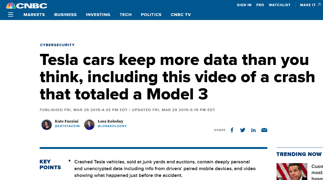 CNBC, Tesla cars keep more data than you think, including this video of a crash that totaled a Model 3