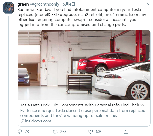 只要一台特斯拉进过维修站,换过 / 升级过车载电脑主板,那么车主的通讯录、通话记录、日历日程、位置轨迹截图等等有的没的,很有可能就已经泄露了。。