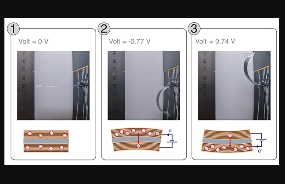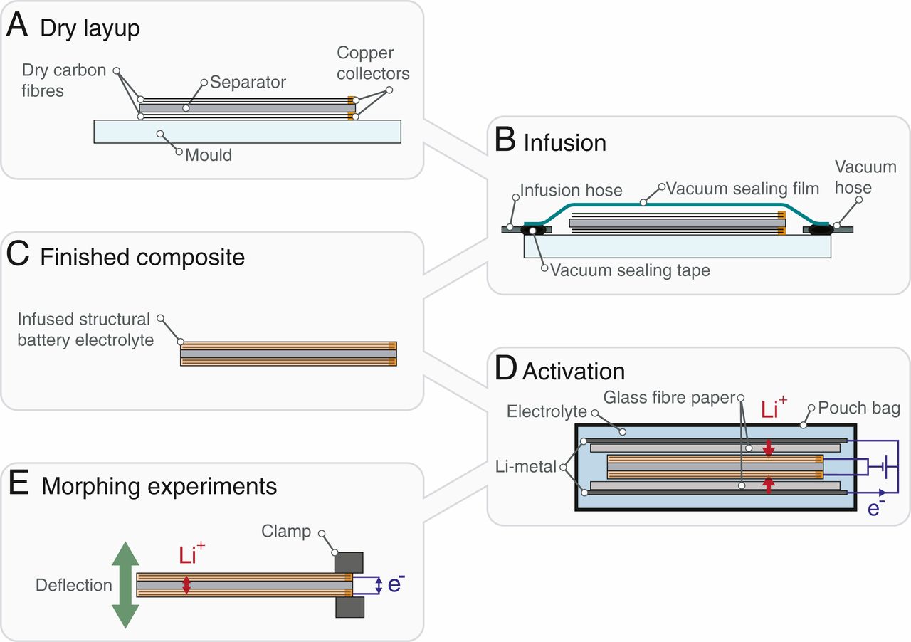 后者更确切的说是 "结构电池电解液",当低压直流电流通过它时,离子会从碳纤维的一层碳纤维迁移到另一层(通过电解液)。这使得碳纤维的放电层收缩,同时使充电层膨胀。因此,整块材料会向一侧弯曲。即使电流被移除后,复合材料仍然保持这种形状。但是,如果在随后的电荷中,电流被反转,锂离子就会向相反的方向迁移。根据电压的不同,这将导致复合材料向后弯曲,要么恢复到中性的平面形状,要么向另一侧弯曲。