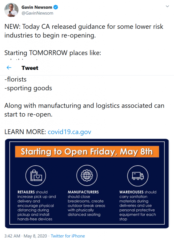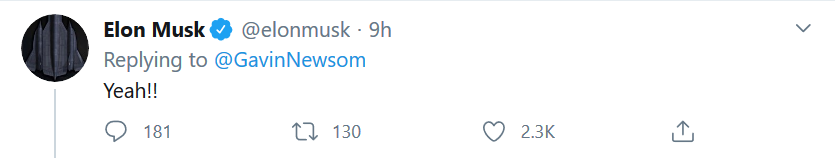 5月8日消息,据国外媒体报道,加州州长加文·纽森(Gavin Newsom)表示,该州决定从本周五开始解除疫情封锁令,允许辖区制造商复工。这一消息受到特斯拉首席执行官埃隆·马斯克的称赞,他立即在Twitter上发推文称 “棒!!”