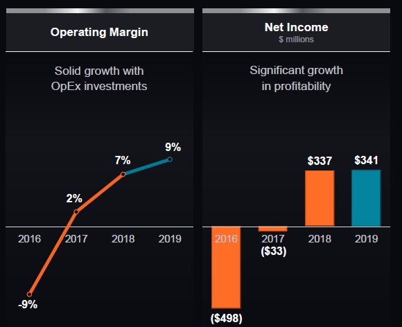 根据AMD公布的数据,2016年的时候,AMD公司的运营利润率还是-9%,2017年的时候就转正了,实现了2%的运营利润,然后一路上涨,2018年运营利润率达到了7%,2019年则有9%。