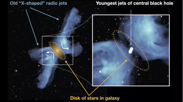 长久以来,天文学家一直在苦苦思索,为什么有些星系会从潜伏在其中心的黑洞中喷出X形射流的射电波。有双射流向相反方向射出的星系很常见,但这种复杂的X形射流的原因并不确定,直到南非的MeerKAT望远镜近距离观察了这些奇怪的宇宙结构后。