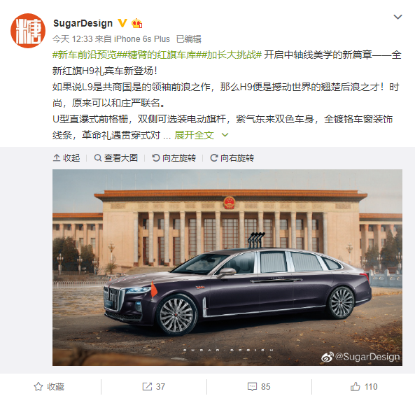 值得一提的是,@Sugar Design还为新车设计了广告语:开启中轴线美学的新篇章——全新红旗H9礼宾车新登场!如果说L9是共商国是的领袖前浪之作,那么H9便是撼动世界的翘楚后浪之才!时尚,原来可以和庄严联名。