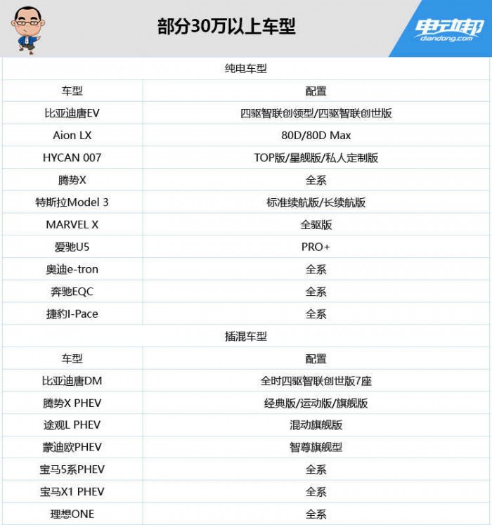 为了应对这种情况,这部分车可以选择自己承担退坡的补贴;或者降价到30万以内,之前我们整理过30万以上车型的名单:
