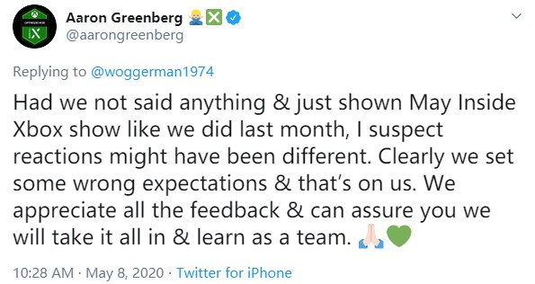 Aaron Greenberg 在其个人 Twitter 中说道:“如果我们像上月所做的那样,不说任何东西并直接播出五月的 Inside Xbox,我猜想大家的反应可能会有所不同。显然我们设定了一些错误的期望,这是我们的失误。我们感谢所有的用户反馈,并向大家保证我们会作为一个团队一同来学习它们。”