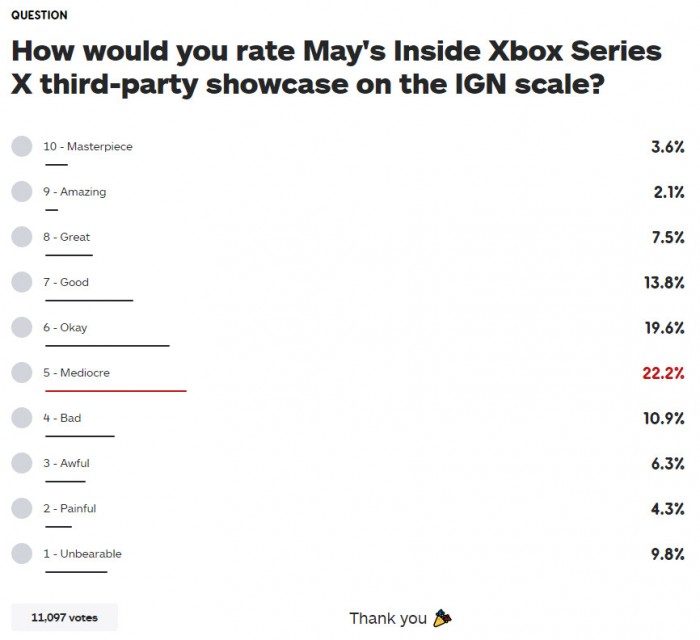 今天(5月8日)游戏媒体 IGN 曾为玩家们做了一个小调查——为本次的 Inside Xbox 打分。从结果来看,总体来说观众的反应有点失望。大部分玩家认为这次的游戏展示很一般,有22%的玩家认为“很平庸”,有19%的玩家认为“还行”,5分以下的投票达到了31.2%,其中将近10%的玩家认为“无法接受”,6分以上的投票只有27.1%。