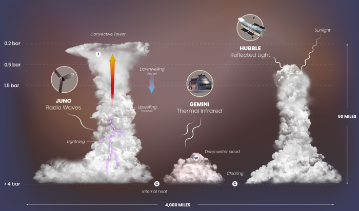 通过将这三方面的信息结合起来,研究小组发现,雷击,以及产生雷击的风暴系统,都是在深层云层上大型对流单元及其周围形成的。最有攻击性的闪电是从一个被称为 "丝状气旋 "的漩涡中观察到的,哈勃和双子座的图像可以俯视到这个漩涡。那原来是由高大的对流云组成的扭曲集合。深层的缝隙揭示了远在下面的水云,通过各种波长的观测,可以建立气旋的三维模型。